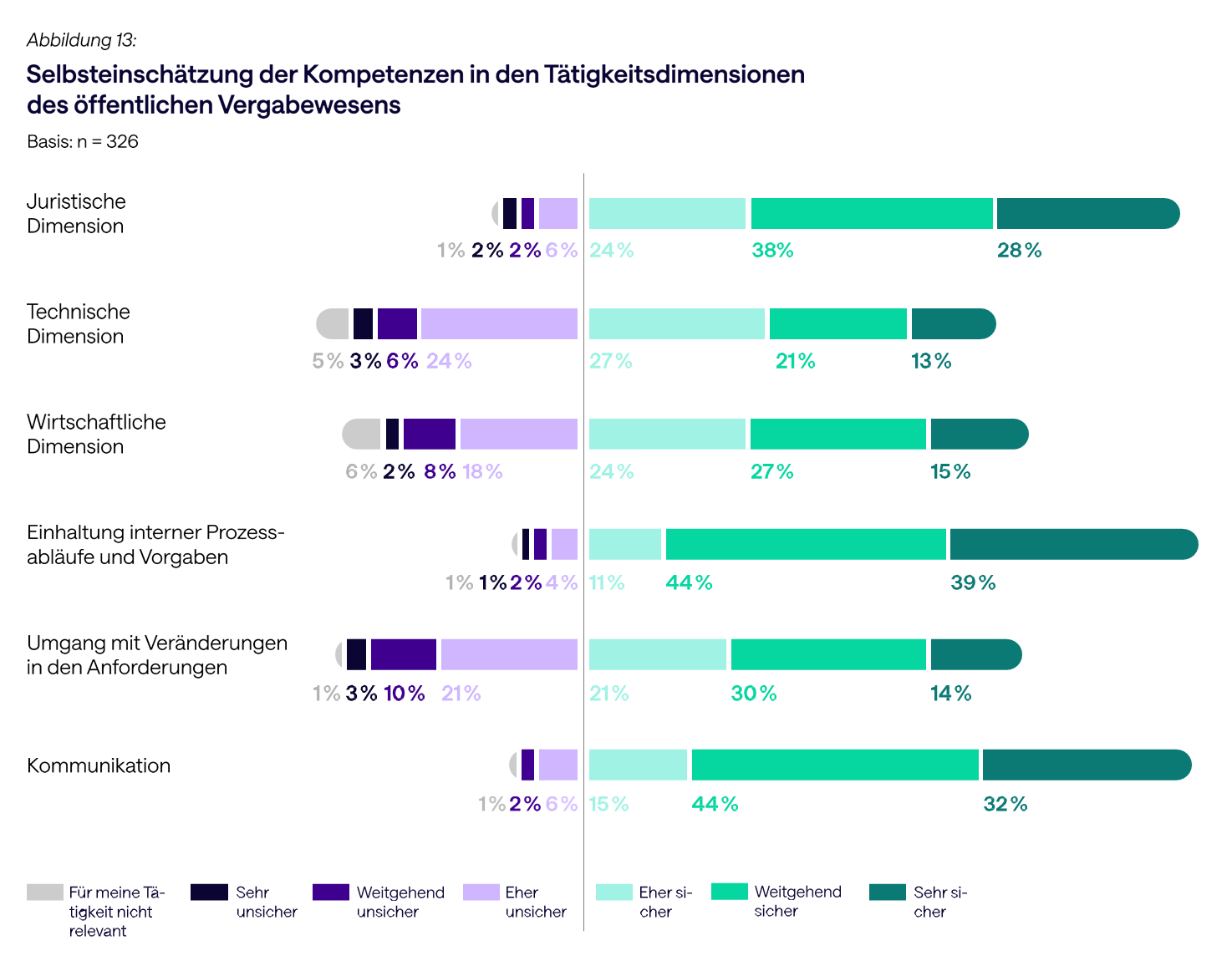 Die Ergebnisse des Trendmonitors zeichnen ein überwiegend positives Bild der Kompetenzen in den Vergabe- und Beschaffungsstellen. Besonders im Bereich Recht, Kommunikation und interner Prozesssteuerung schätzen sich über 90 % der Befragten als sicher ein – ein außergewöhnlich hoher Wert, der die Professionalität der Vergabeorganisationen unterstreicht. Unsicherheiten zeigen sich dagegen häufiger in der wirtschaftlichen und technischen Dimension – also bei Fragen wie „Wie kaufe ich ein?“ und „Was kaufe ich ein?“. Im Vergleich zur Studie von 2023 fällt zudem auf, dass der Umgang mit veränderten Anforderungen mehr Unsicherheit erzeugt. Dies deutet darauf hin, dass jüngste gesetzgeberische Initiativen – beispielsweise das Bundestariftreuegesetz oder das Vergabebeschleunigungsgesetz – zu zusätzlicher Komplexität geführt haben (siehe Abb. 13).