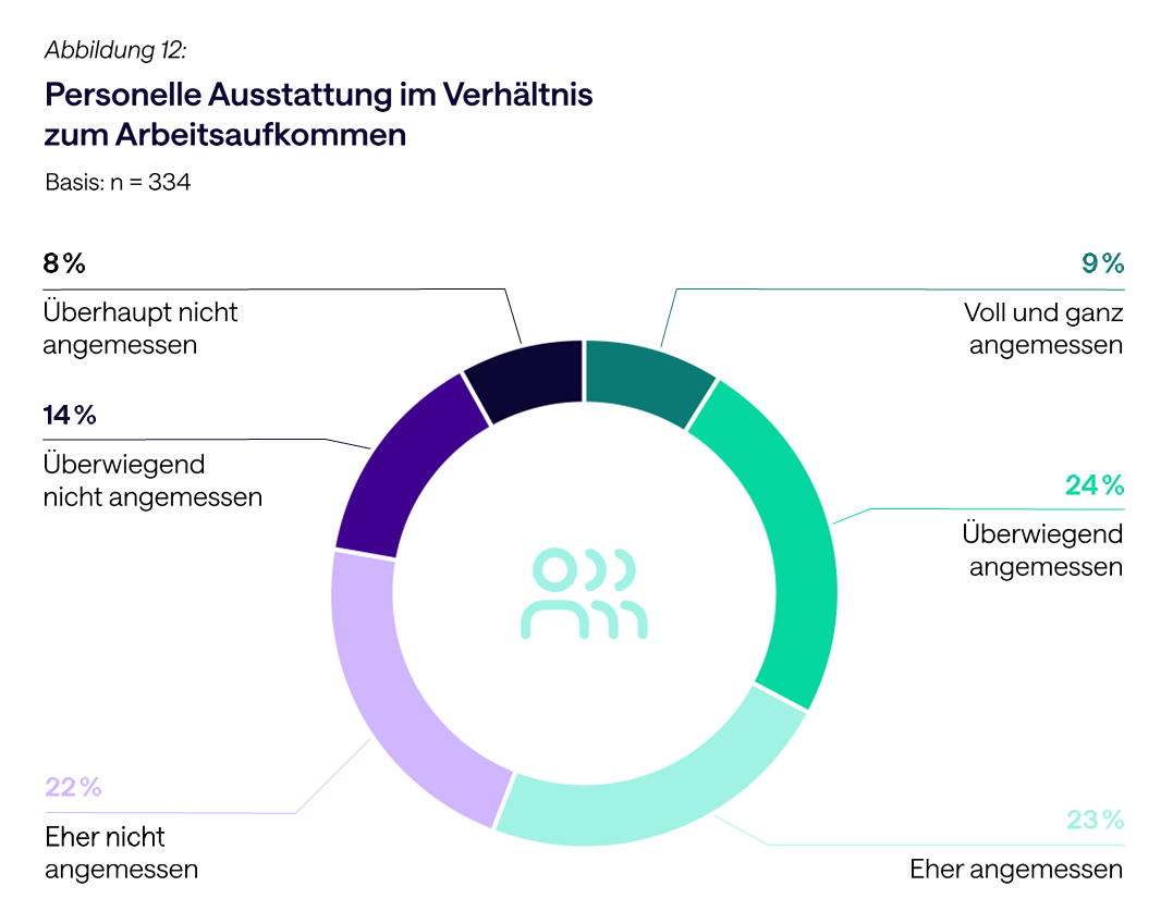 Gleichzeitig wird sichtbar, dass Vergabe- und Beschaffungsstellen zunehmend an strukturelle Grenzen stoßen: Das Arbeitsaufkommen wächst, die Anforderungen steigen, aber die Ressourcen bleiben knapp. Fast die Hälfte der Teilnehmenden bewertet die personelle Ausstattung im Verhältnis zum Arbeitsaufkommen als nicht ausreichend (siehe Abb. 12).