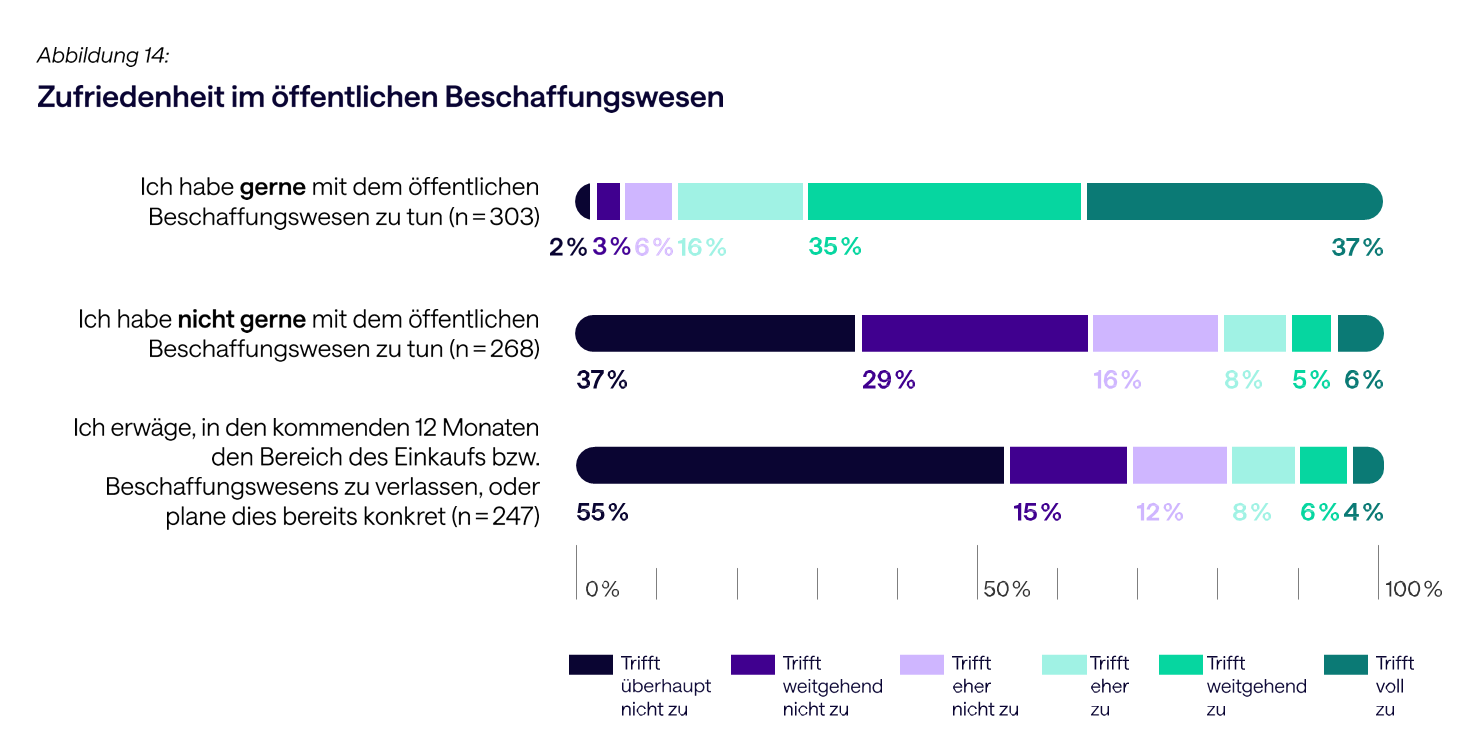 Trotz der angespannten Ressourcenlage herrscht eine bemerkenswert positive Grundstimmung: 88 % der Befragten geben an, gerne im Vergabewesen zu arbeiten (siehe Abb. 15). Viele fühlen sich von ihren Organisationen gut unterstützt, insbesondere durch Fort- und Weiterbildungsangebote. Dieses Commitment ist ein zentraler Stabilitätsfaktor in einer zunehmend komplexen Vergabelandschaft. (siehe Abb. 14).