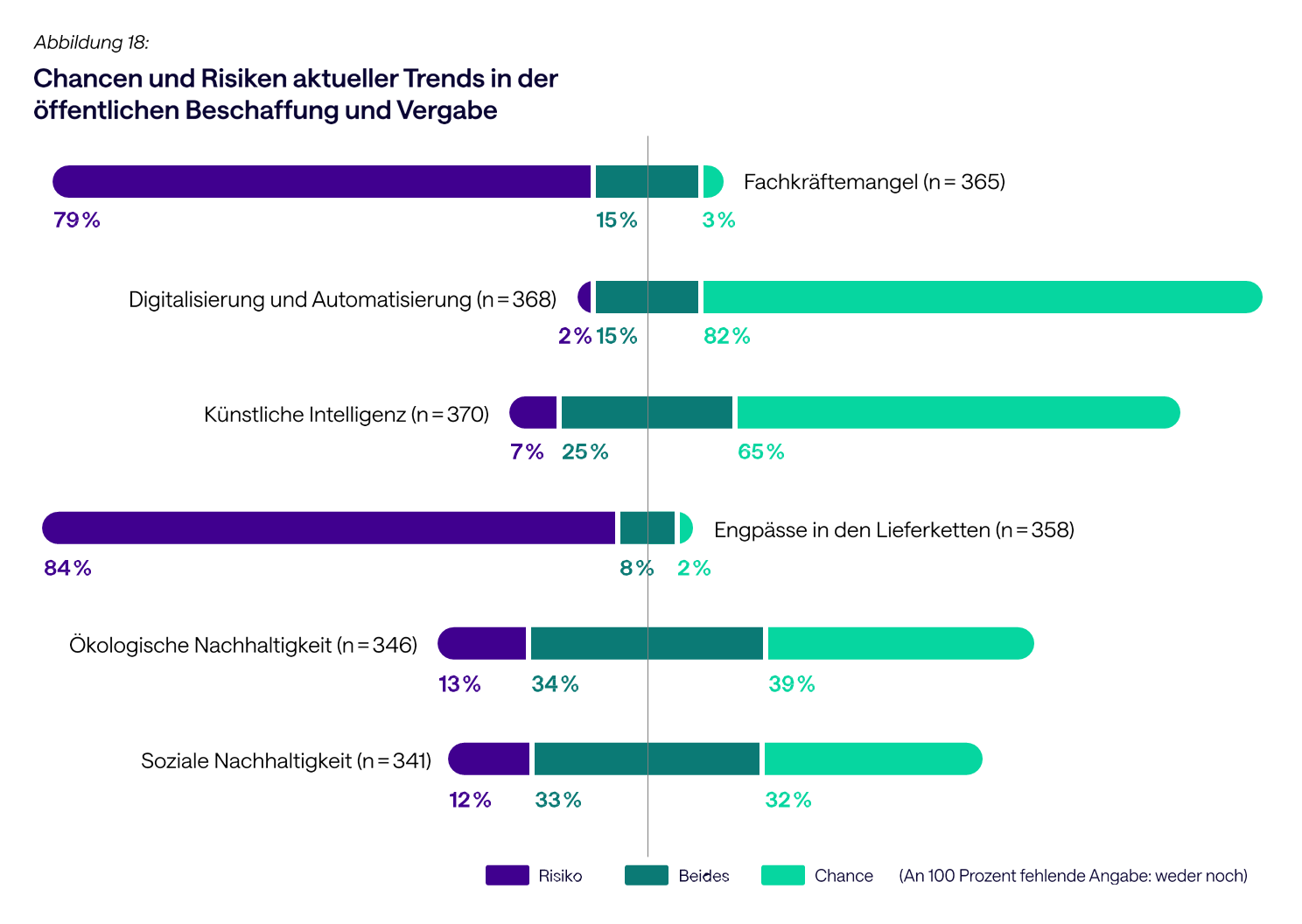 Zugleich zeigt sich bei technologischen Entwicklungen ein deutlich optimistisches Stimmungsbild: Die Mehrheit der Befragten sieht in Digitalisierung, Automatisierung und insbesondere Künstlicher Intelligenz klare Chancen für eine leistungsfähigere, entlastete und zukunftsfähige Vergabepraxis. Aus Sicht der Praxis liegt das Potenzial damit weniger in neuen Regelwerken als vielmehr in einer intelligenteren Gestaltung und Steuerung der Prozesse – unterstützt durch digitale Werkzeuge, die genau dort ansetzen, wo heute die größten Engpässe entstehen (siehe Abb. 18).
