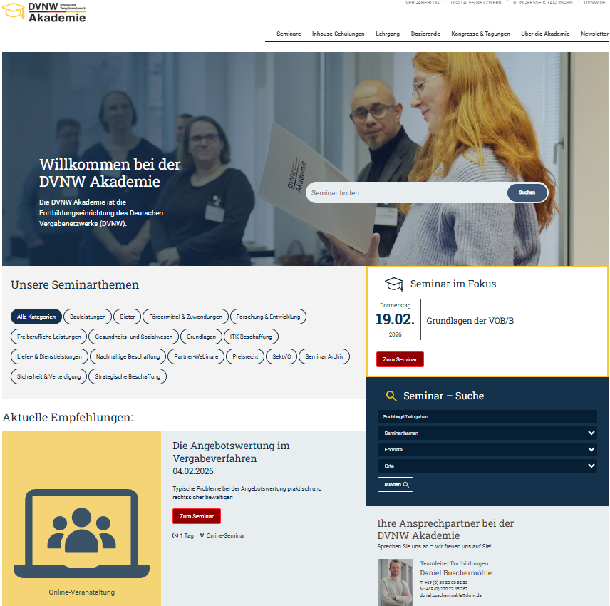 Wir freuen uns, Ihnen die neue Website der DVNW Akademie präsentieren zu dürfen – Ihr zentraler Anlaufpunkt für praxisnahe Weiterbildung im Vergaberecht und der öffentlichen Beschaffung! Als Fortbildungseinrichtung des Deutschen Vergabenetzwerks bündelt die DVNW Akademie mit der neu aufgelegten Website ihr komplettes Angebot an Seminaren, Inhouse-Schulungen, Lehrgängen und Expert:innenwissen jetzt in einer übersichtlichen, intuitiven und nutzerfreundlichen Online-Präsenz in ganz neuem Gewand.